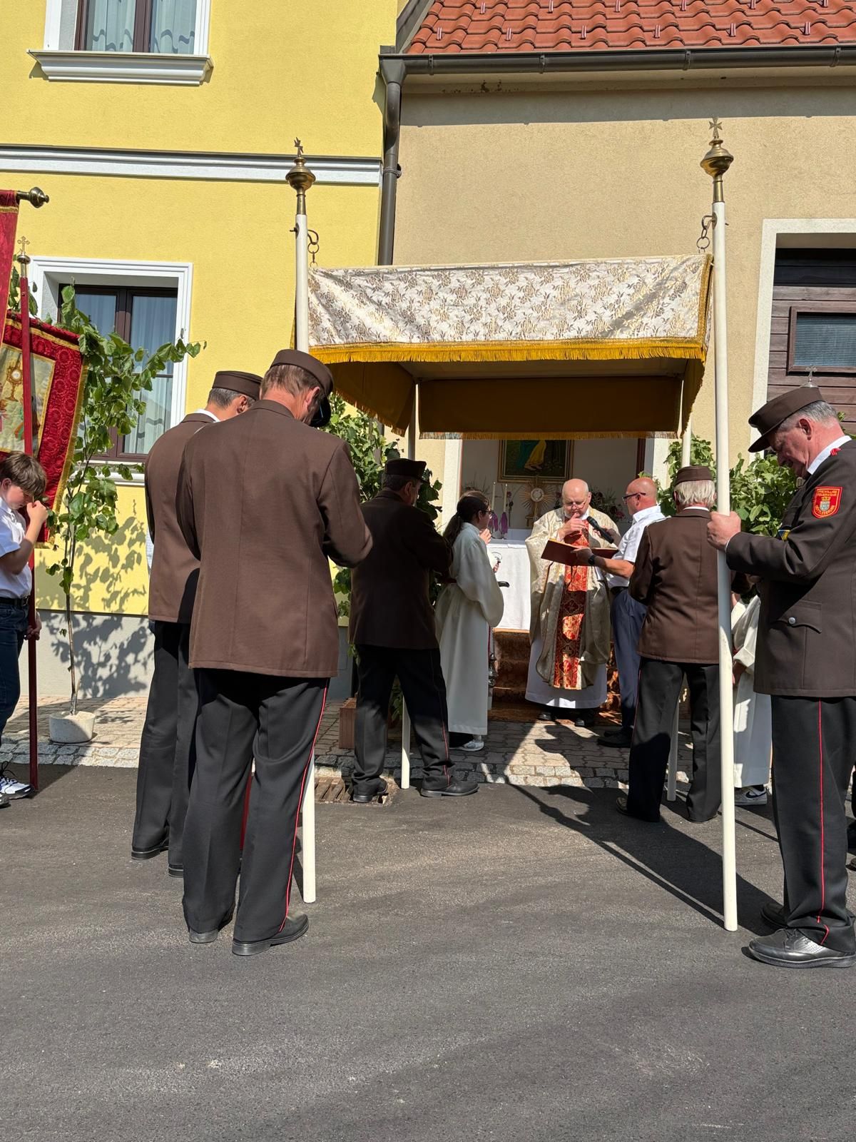 Die feierliche Fronleichnamsprozession hat dieses Jahr bei strahlendem Sonnenschein und fast schon sommerhaften Temperaturen stattgefunden. Musikalisch umrahmt von der Jugendblasmusikkapelle Göttlesbrunn-Arbesthal und unter zahlreichter Beteiligung der Pfarrgemeinde führte die Prozession durch die mit Blumenschmuck und Stauden gesäumten Straßen Göttlesbrunns. An vier festlich dekorierten Hausaltaren wurde jeweils ein Halt für ein Evangelium und einen Segen gemacht. Ein ganz herlicher Dank an die Freiwillige Feuerwehr Göttlesbrunn, die Kinder des Kindergarten und der Volksschule sowie an die Firmkandidat*innen.