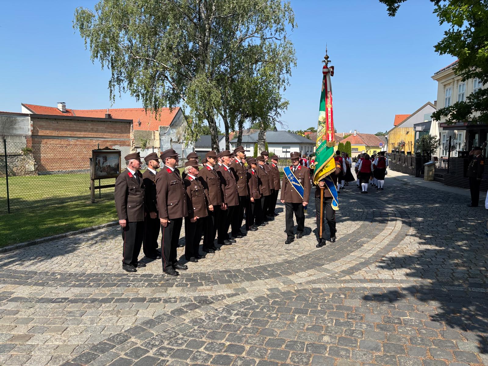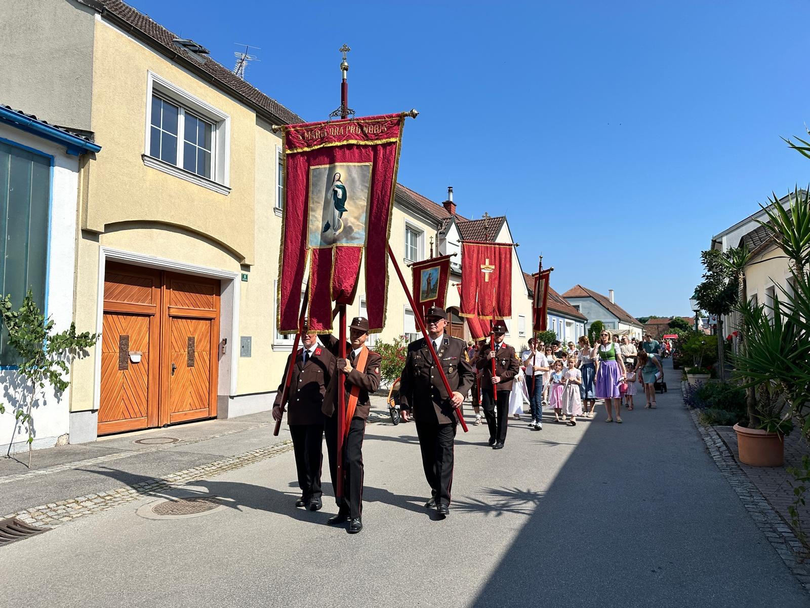 Bei schönem Sommerwetter fand wieder die jährliche Prozession durch den festlich geschmückten Ort statt. Sämtliche Generationen, von Kleinkindern im Kinderwagen bis Senior*innen im Feuerwehr-Begleitfahrzeug, haben and diesem Festumzug teilgenommen. Die Jugendblasmusik Göttlesbrunn-Arbesthal sorgte wieder für die musikalische Umrahmung. Auch eine Premiere hat es dieses Jahr gegeben: die Festlieder wurden diesmal von drei (sehr schöne) Sängerinnen angestimmt.